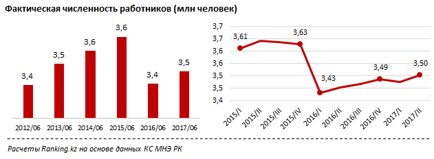 Фактическая численность наемных работников в РК в январе-июне текущего года составила 3,5 миллиона человек. Это всего на 1,5 процента больше уровня численности годом ранее.