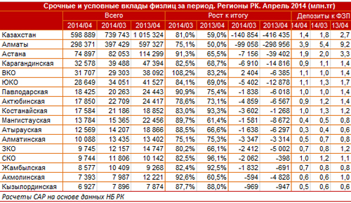 Как отмечается, самый большой разрыв между объемом размещенных депозитов и фондом заработной платы зафиксирован в Алматы. В апреле месячный депозитный транш населения в 3,9 раза превысил городской зарплатный фонд (298,4 против 75,7 миллиарда тенге).