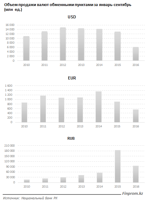 В целом долларовые продажи к 2015 году сократились на 53 процента, рублевые на 48, а продажи евро на 37 процентов. В тенговом эквиваленте по традиционной валютной корзине (доллар, евро, рубль) объем продаж за три квартала составил 2,9 триллиона тенге. Из них 75 процентов занял доллар, 17 - рубль.
