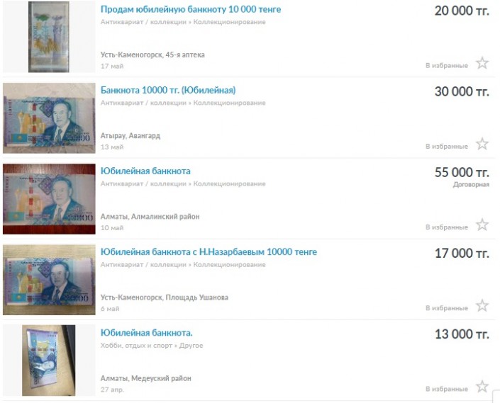 Объявления о продаже юбилейных банкнот номиналом 10 тысяч тенге с изображением Президента Казахстана Нурсултана Назарбаева появились в Сети, передает корреспондент Tengrinews.kz.