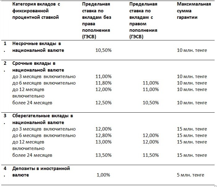 С 1 октября 2018 года в Казахстане изменились гарантии по депозитам. Раньше гарантированная сумма была ограничена 10 миллионами тенге. Теперь в зависимости от срока и возможности досрочного снятия денег вкладчики получат разный уровень защиты своих денег. Максимальная сумма гарантии повысилась до 15 миллионов тенге.