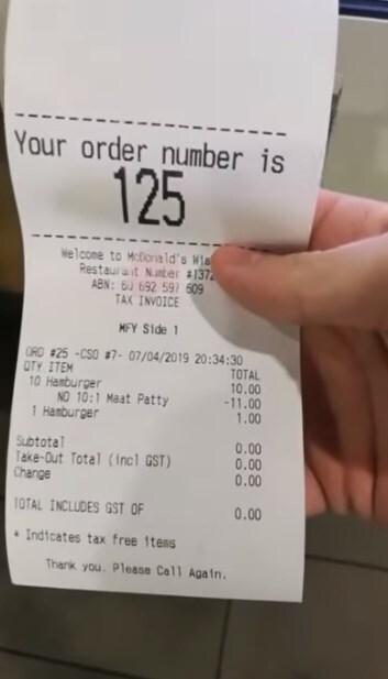 После этого покупатель выбрал еще один бургер - тот же, но уже полноценный, с мясом. Его стоимость составила 2,5 доллара. После такого количества бургеров автомат включает дополнительную скидку, по которой каждый бургер идет за один доллар. Однако вместо того, чтобы добавить стоимость первой части заказа ко второй, автомат самообслуживания пересчитал акции и спецпредложения и выдал нулевой чек.