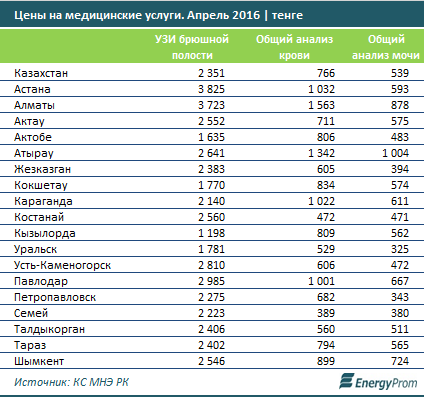 "Общий анализ крови в среднем по РК в апреле стоил 766 тенге (плюс 9,4 процента за год), мочи - 539 тенге (плюс 10 процентов). Разлет цен по первому составил от 1563 тенге (Алматы) до 389 тенге (Семей), по второму - от 1004 тенге (Атырау) до 325 тенге (Уральск)", - отмечается в исследовании.