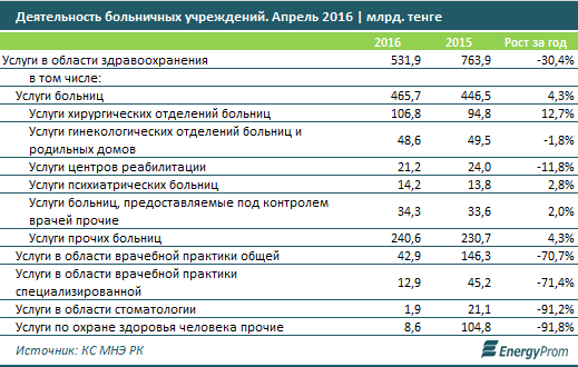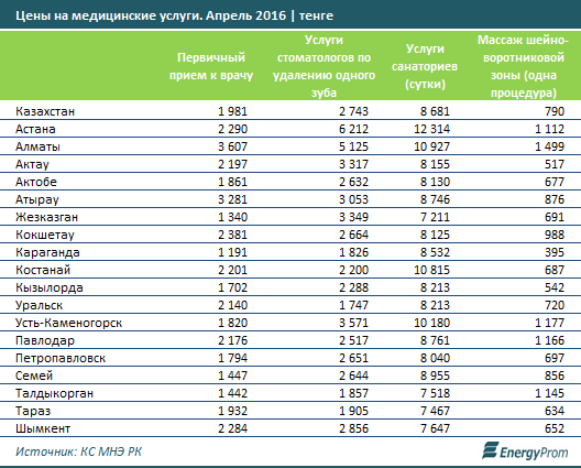 Отмечается также, что сильнее всего первичный прием подорожал за год в Костанае - сразу на 69,4 процента, достигнув по итогам апреля 2016 года 2381 тенге. Удешевление отмечено только в Караганде - минус 4,2 процента.