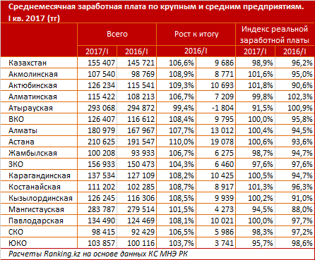 В региональном разрезе самые высокие заработные платы, традиционно, наблюдались в нефтяных регионах и столице (Атырауская область - 256,2 тысячи тенге, -0,4 процента за год, Мангистауская - 247,3 тысячи, +0,4 процента за год, Астана - 203,5 тысячи тенге, +7,6 процента за год). Самый высокий годовой рост номинальных заработных плат отмечен в Астане, Акмолинской и Актюбинской областях (на +7,6 процента). При этом индекс реальной заработной платы положителен лишь в последних двух регионах - 100,3 процента.
