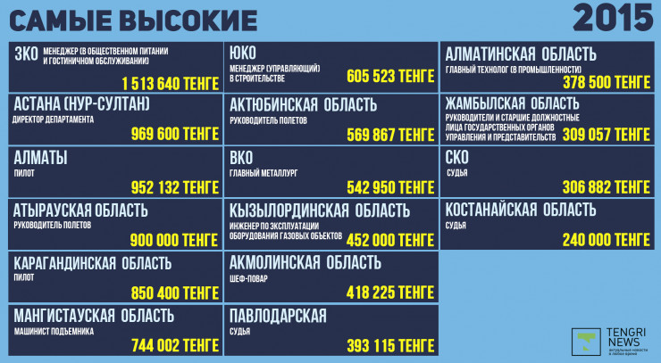 В 2015 году самая высокая зарплата была у управляющего в общественном питании и гостиничном обслуживании, 1 513 640 тенге.