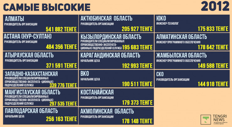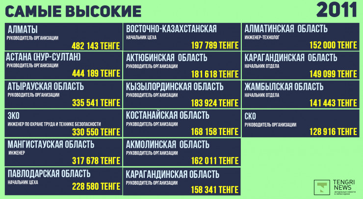 В 2011 году рейтинг самых высоких зарплат также возглавил оклад руководителя организации в Алматы, 482 143 тенге.