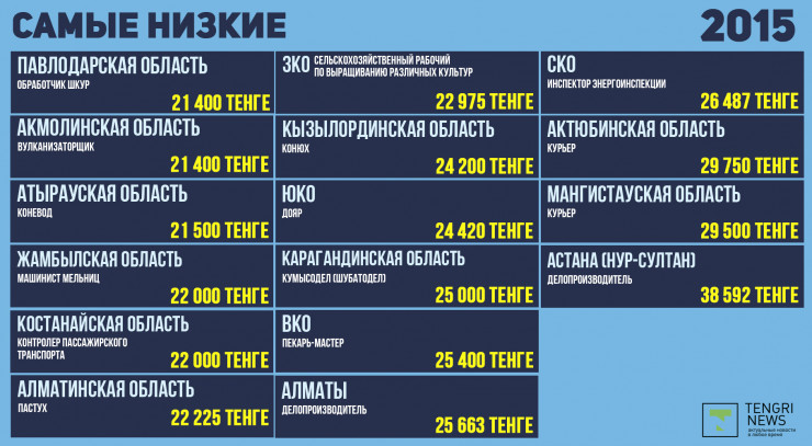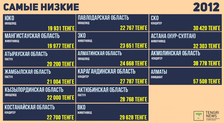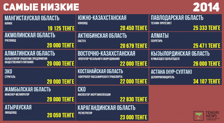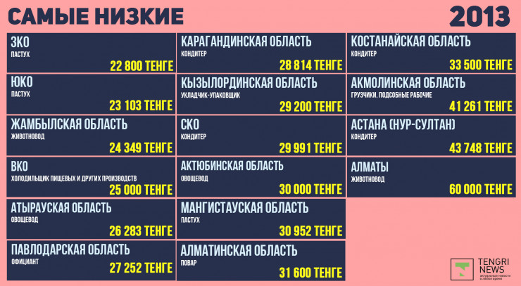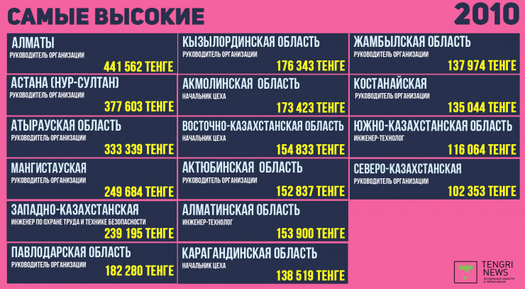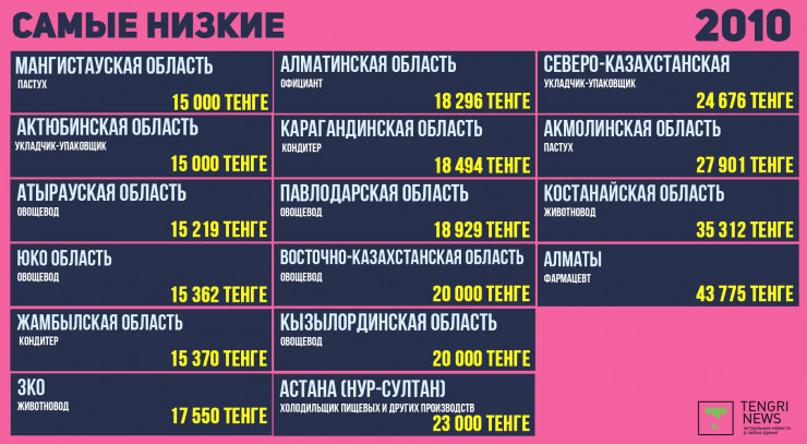 В 2010 году меньше всех в Казахстане зарабатывал пастух в Мангистауской области, 15 000 тенге в месяц. Больше всех - руководитель организации в Алматы, 441 562 тенге.