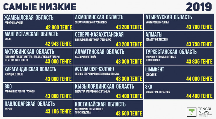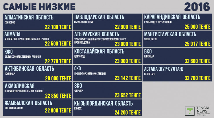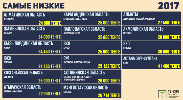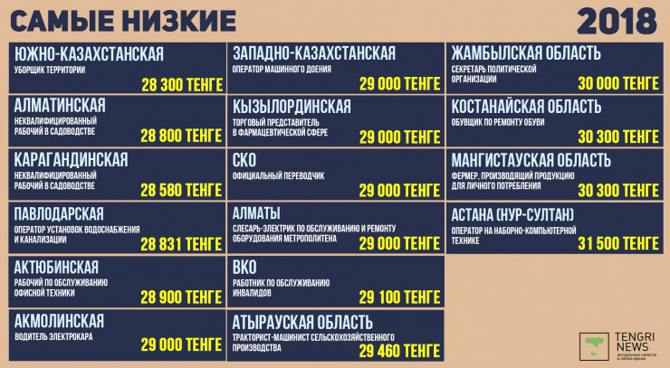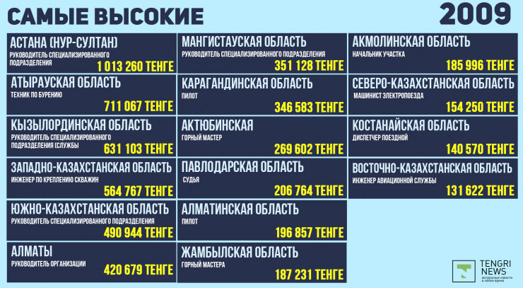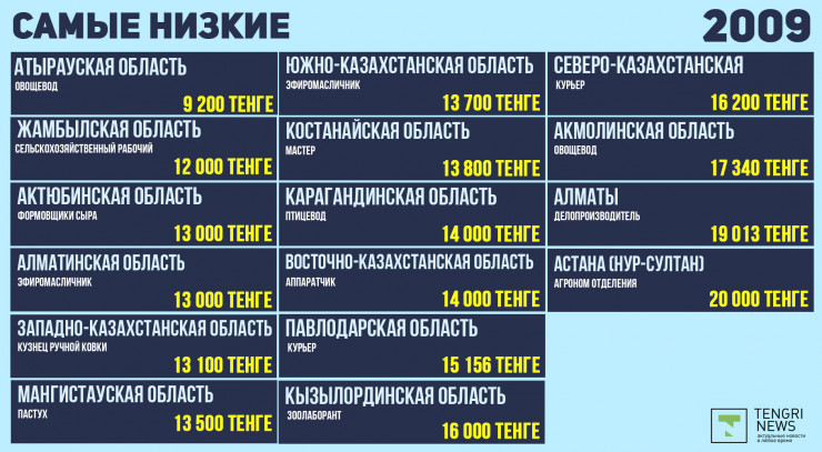 По данным Комитета по статистике РК, в 2009 году самая низкая зарплата была у овощевода в Атырауской области, 9200 тенге. Самой высокой официально зарегистрированной зарплатой является оклад руководителя специализированного подразделения в Астане (Нур-Султан), 1 013 260 тенге.