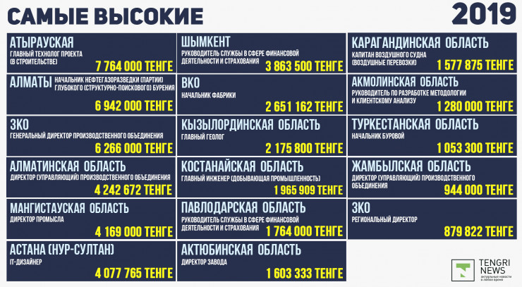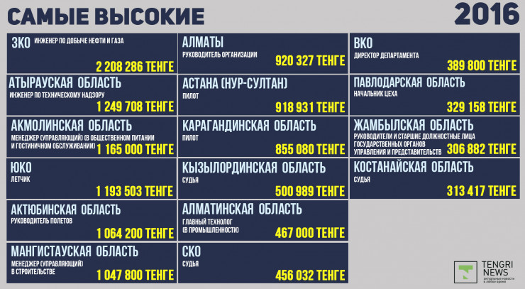 В 2016 году самая высокая зарплата по Казахстану зафиксирована в Западно-Казахстанской области. 2 208 286 тенге получал инженер по добыче нефти и газа.