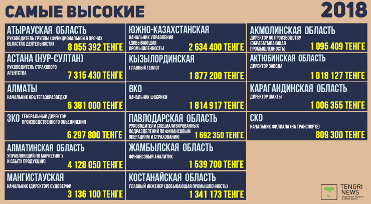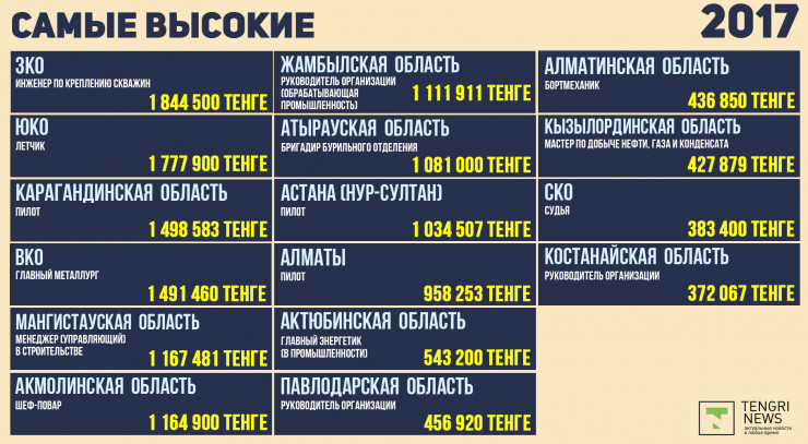Сумма 1 844 500 тенге была зафиксирована как самая высокая, а 24 000 - как самая низкая зарплата в 2017 году.