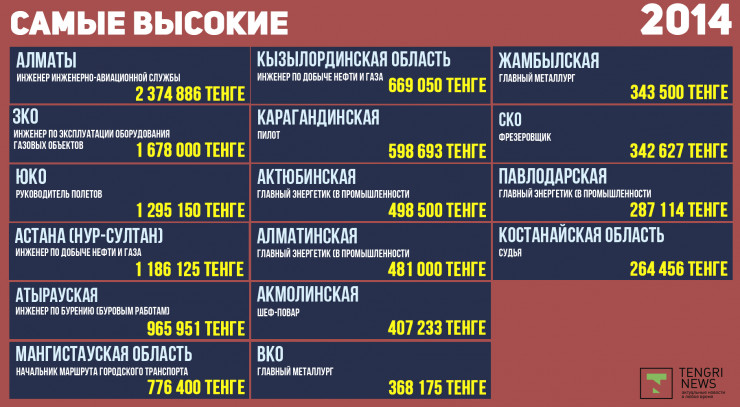 В 2013-м самой высокой зарплатой было 528 658 тенге, самой низкой - 22 800 тенге.