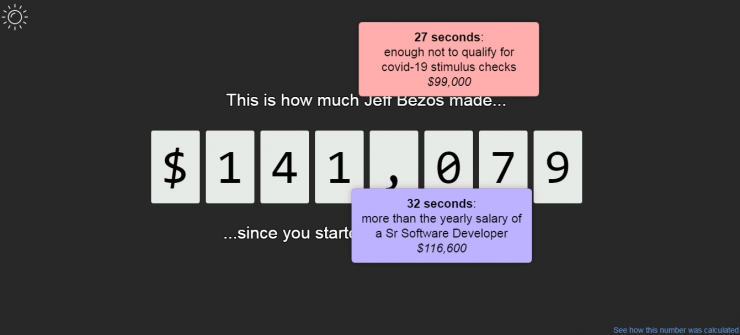 На сайте Bezos Calculator можно узнать, на сколько выросло состояние Безоса с того момента, как пользователь открыл веб-страницу.