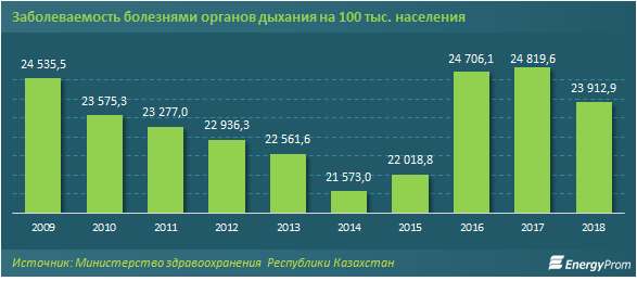 Эксперты также подсчитали, сколько казахстанцев страдает от болезней органов дыхания. В 2018 году из 100 тысяч населения болели 23,9 тысячи человек. А вот пять лет назад заболеваемость органов дыхания была ниже на шесть процентов.