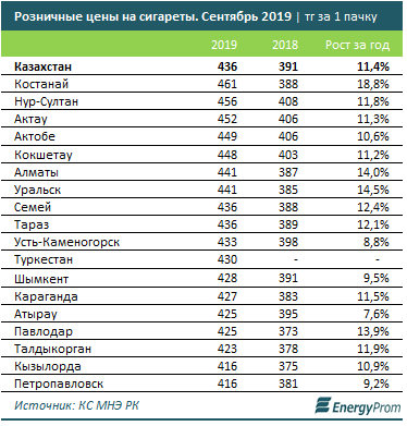 В сентябре 2019 года средняя стоимость одной пачки составила 436 тенге. В этот же период прошлого года сигареты стоили на 11,4 процента дешевле - 391 тенге. Дороже, чем другим, одна пачка сигарет обходится жителям Костаная (461 тенге), Нур-Султана (456 тенге) и Актау (452 тенге).