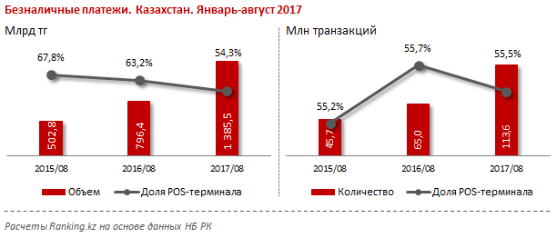 Объем платежей через POS-терминалы за год вырос на 49,5 процента (249 миллиардов тенге), до 752,1 миллиарда тенге. Количество транзакций за январь-август 2017 года составило 63 миллиона, что на 74,2 процента (26,8 миллиона) больше, чем в прошлом году.