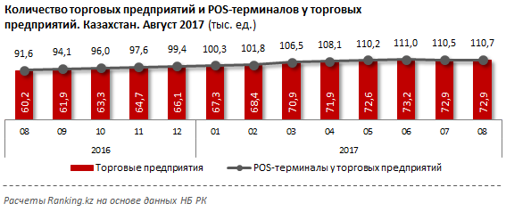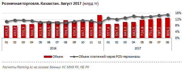 По данным портала, доля безналичных платежей через POS-терминалы в общем объеме розничной торговли, который составил 5,5 триллиона тенге за январь-август 2017 года, за год выросла с 10,6 процента до 13,7 процента.