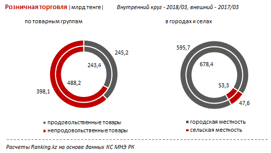 На продовольственные товары казахстанцы потратили всего треть оставленных в магазинах и прочих точках продаж средств (243,4 миллиарда тенге). Еще более чем две трети, или 488,2 миллиарда тенге, ушло на непродовольственные товары.