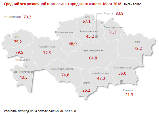Наибольшие средние чеки - у алматинцев (121,3 тысячи тенге за человека, +5,4 процента к февралю) и астанчан (83,9 тысячи тенге на человека, сразу на 30,7 процента больше, чем месяцем ранее).