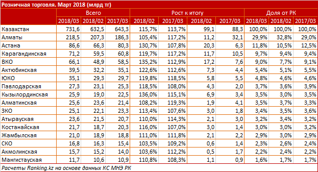 "Впрочем, март не только богат праздниками, что стимулирует торговлю, но и на три дня длиннее, чем февраль, что также влияет на разницу в объемах ритейла. С другой стороны, годовой рост объемов продаж в магазинах и на рынках составил 13,7 процента - в этом марте казахстанцы проявили большую склонность к совершению покупок, чем в прошлом году", - отмечают аналитики.