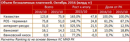 Сообщается, что розничная торговля стимулирует рост безналичных платежей. Так, в октябре через POS-терминалы казахстанцы оплатили покупки на 75,8 миллиарда тенге (рост на 48,7 процента за год), и еще на 31 миллиард тенге - через интернет-ресурсы (рост по сравнению с прошлым годом в 3,3 раза).
