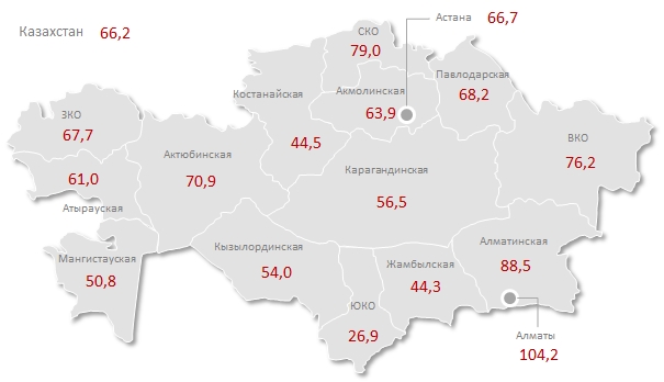 Наибольший годовой рост в денежном выражении наблюдается в Павлодарской области - плюс 21,5 тысячи тенге, до 68,2 тысячи тенге на городского жителя.