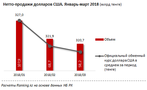 В свою очередь, в этом году тенге укреплялся к доллару в среднем три месяца подряд. В январе один доллар стоил 327 тенге, в феврале - 321,9 тенге, в марте - 320,7 тенге. Вместе с курсом уменьшался и объем нетто-продаж долларов обменными пунктами, говорится в исследовании. В январе объем нетто-продаж составил 107,9 миллиарда тенге, в феврале уменьшился до 68,7 миллиарда тенге, в марте - до 58,2 миллиарда тенге.