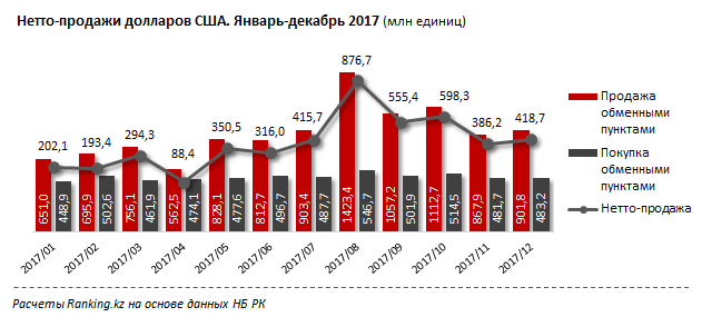 По данным аналитиков, в  2017 году казахстанцы купили в обменных пунктах 10,6 миллиарда долларов, а сдали 5,9 миллиарда долларов. Нетто-продажи (продажа валюты обменными пунктами минус покупка) составили 4,7 миллиарда долларов.