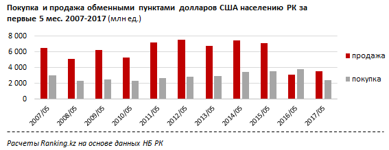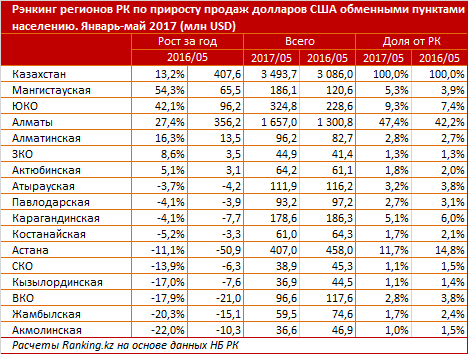 В этом году всего в шести регионах РК из 16 был зафиксирован рост объемов покупок населением долларов в обменных пунктах. За январь-май 2017 года сильнее всего спрос на наличную валюту вырос в Мангистауской области - объем покупок увеличился на 54,3 процента или на 65,5 миллиона долларов.