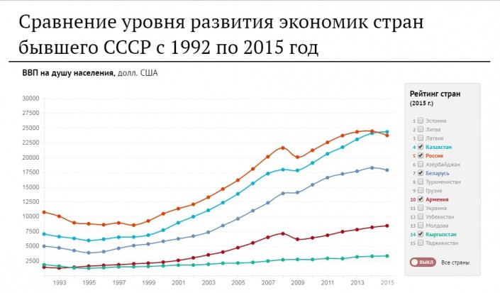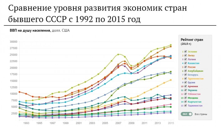 Агентство РИА Новости составило инфографику, в которой приводится сравнение уровня развития экономик стран бывшего СССР с 1992 по 2015 год.