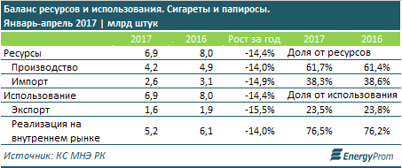 За январь-май было произведено лишь 5,1 миллиарда штук сигарет и прочих табачных изделий (22 процента). Для сравнения, показатели января-мая 2016 года демонстрировали годовое снижение к аналогичному периоду 2015 года на 5,9 процента.