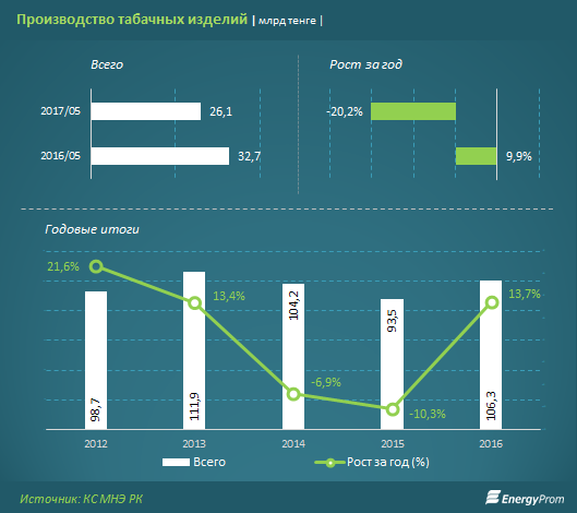 Спад наблюдается и в денежном выражении - так, за январь-май объемы производства табачных изделий составили 26,06 миллиарда тенге, на 20,2 процента меньше, чем в аналогичном периоде годом ранее.