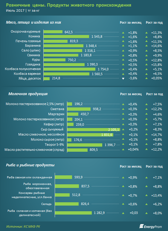 Исследователи отмечают, что хотя по итогам прошлого месяца, июня, инфляция составляла 7,5 процента за год и все еще оставалась в пределе коридора, назначенного Нацбанком (менее 8 процентов), продовольственные товары показали годовой рост цен почти на 10 процентов. Более того, глава Нацбанка допускает, что инфляция может выйти за верхний предел коридора (то есть будет выше 8 процентов) и шоковые предложения на рынке продовольственных товаров будут продолжаться.