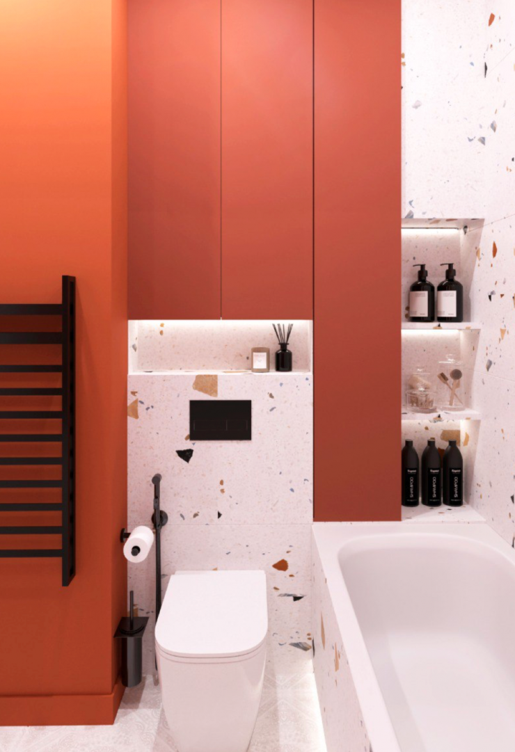 По словам дизайнера, одним из самых затратных пунктов в ремонте является отделка уборных комнат. "На самом деле туалетная зона – это не влажная зона, и кафель там не требуется. Современным решением является отделка наполовину. Так, водопроницаемая зона может состоять из плитки, а остальная часть - из краски или других материалов", - отмечает эксперт. К слову, белый глянец сантехкерамики лучше подчеркнут акцентные стены.