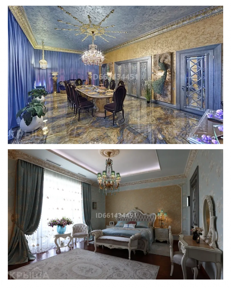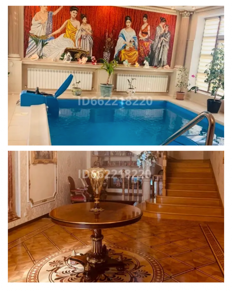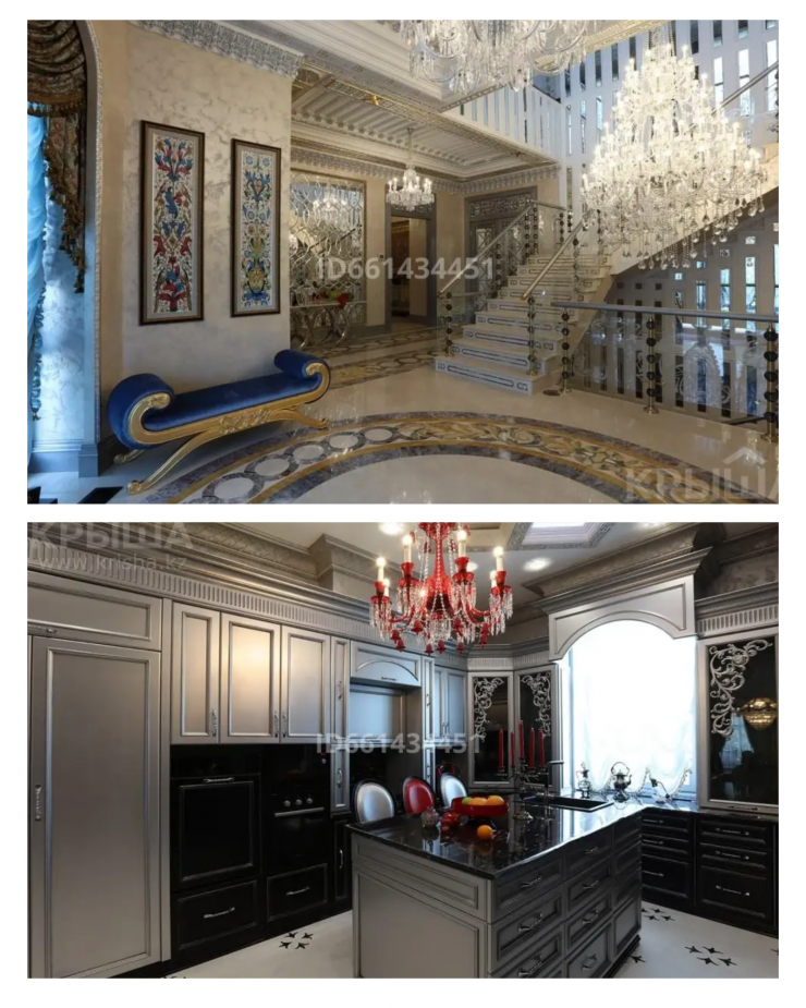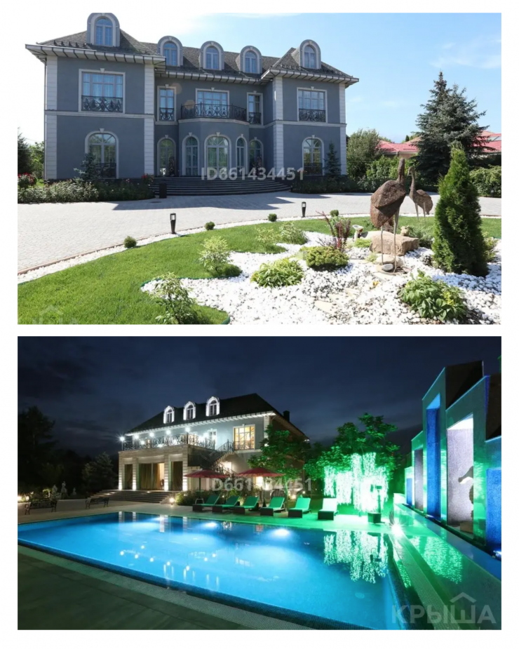 Этот дом расположен в столице, общая площадь составляет 608 квадратных метров, территория - 32 сотки. Цена дома с бассейном, просторным холлом и собственной детской площадкой составляет 2 миллиарда тенге. Интерьер выполнен в коричневом и золотистом цветах, комнаты щедро украшены колоннами, картинами и фресками.