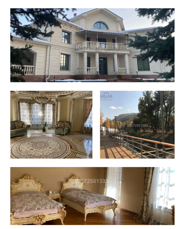 За 1,9 миллиарда хозяева предлагают отдельно стоящую баню, бассейн, хозяйственные постройки, круглосуточную охрану (видеонаблюдение и сигнализация) и сам дом в стиле барокко. Согласно описанию, дом находится в экологически чистом районе Алматы. Территория участка составляет 30 соток, а площадь самого особняка - 900 квадратных метров. Построен дом в 2015 году, фасад выполнен из травертина.