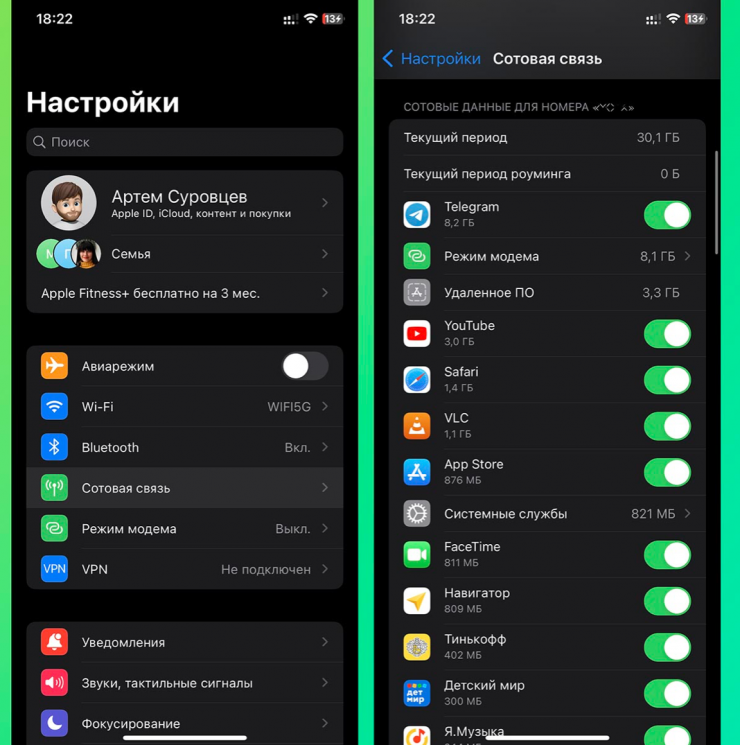 - Как настроить: откройте "Настройки" – "Сотовая связь", в списке найдите самые прожорливые и ненужные приложения. Для них можно смело ограничить доступ к мобильному интернету.