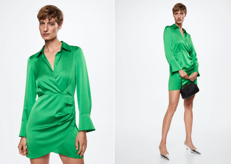 Этот вариант подойдет тем, кто любит сочетать минимализм и максимализм одновременно. Насыщенный зеленый цвет в аккуратном исполнении смотрится дорого, а если добавить к нему высокую шпильку и клатч, то наряд получится по-настоящему вечерним и новогодним. Такое платье можно отыскать также в массмаркете, например, в Mango оно стоит 19 990 тенге.