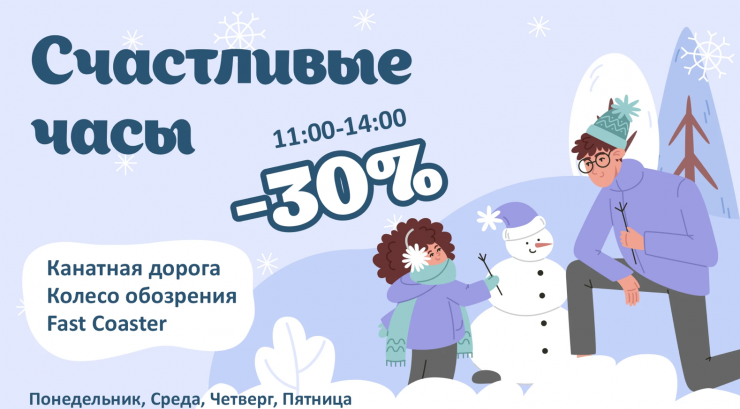 "Счастливые часы" на Кок-Тобе – в будние дни с 11:00 до 14:00, за исключением вторника, можно приобрести билеты с 30-процентной скидкой на канатную дорогу, колесо обозрения и экстремальный маршрут. Акция действует до 28 февраля.