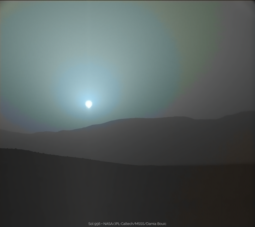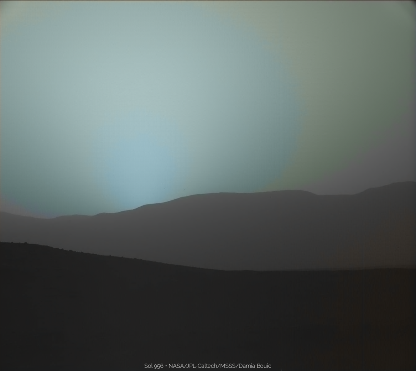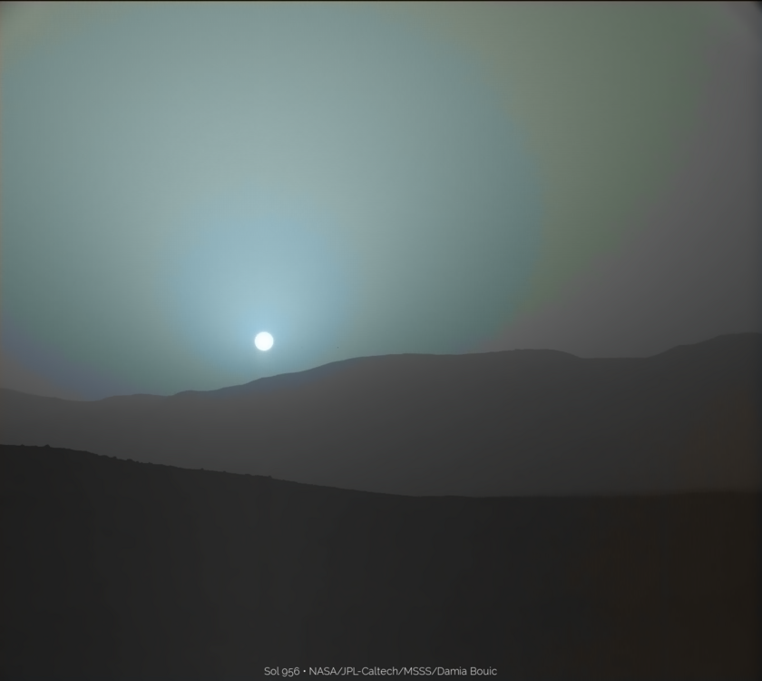 Как видно на снимках, на Марсе, когда светило уходит за горизонт или восходит, в небе появляются оттенки голубого и синего цветов, в отличие от нашей планеты, где небо окрашивается в оранжевый или красный цвета. Это связано с тем, что в атмосфере Марса в большом количестве присутствует пыль, которая лучше рассеивает именно синий спектр солнечного цвета.