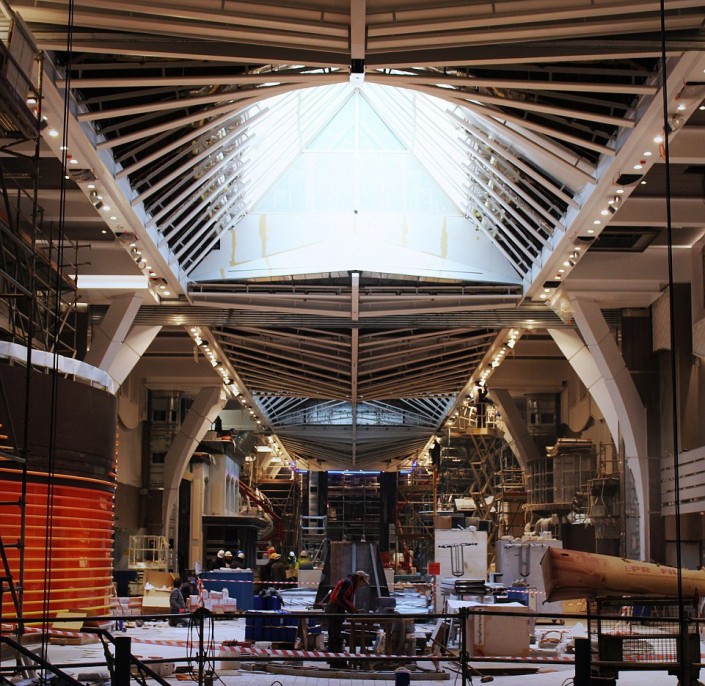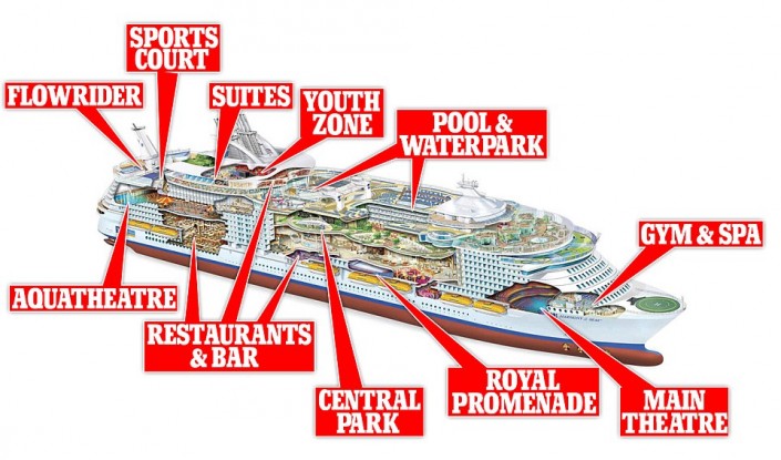На борту гиганта будут работать 40 ресторанов и десятки магазинов, театр на 1400 мест, бассейны с генераторами волн, мини-поле для гольфа, площадка для игры в баскетбол, многочисленные сауны и водная горка через все палубы, которая является самой длинной на аналогичных лайнерах.
