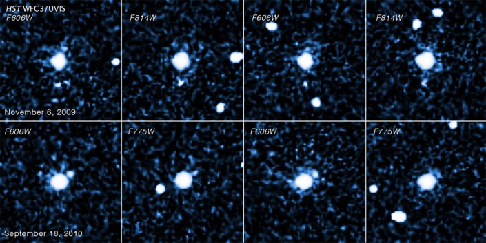 Руководствуясь этой идеей, астрономы проанализировали архивные фотографии 2007 OR10, полученные "Хабблом" и "Спитцером" за последние десять лет. К их большому удивлению, им очень быстро удалось найти луну 2007 OR10, которую можно легко увидеть на сразу нескольких снимках с "Хаббла", полученных в 2009 и 2010 годах.