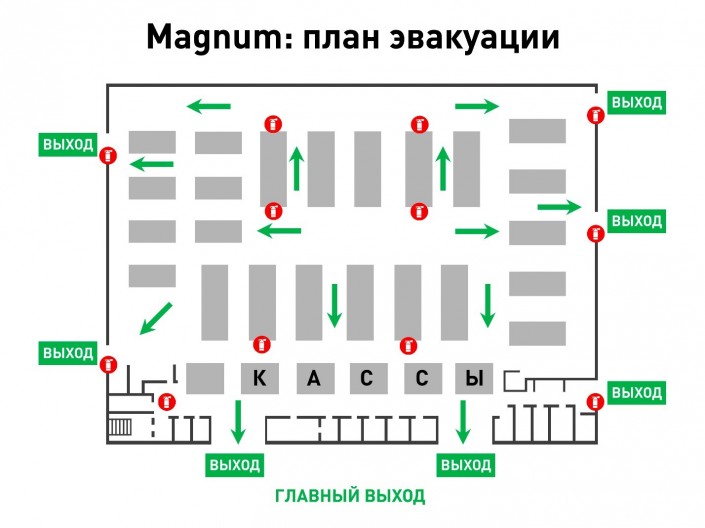 По периметру торгового зала висят подробные планы эвакуации. Схематически эвакуация из магазина выглядит примерно так: