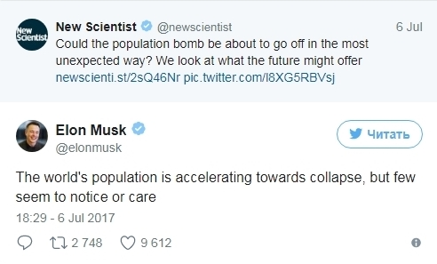 На своей странице в Twitter инженер ответил на вопрос журнала New Scientist о будущем человеческой популяции. "Рост численности населения в мире ускоряется, что приведет к краху, но мало кто это замечает или заботится об этом", - написал Маск.