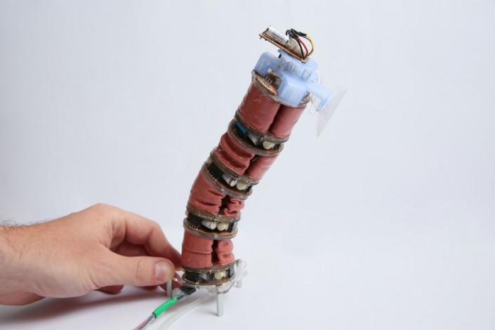 Каждая секция может сжиматься, что позволяет роботу сгибаться и даже ползти. С помощью присосок он может прикрепляться и к стенам.