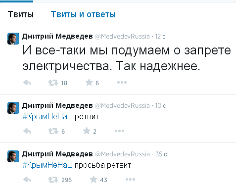 Кроме этого, по всей видимости, хакеры от лица Медведева также ретвитнули несколько сообщений других пользователей Twitter: "@MedvedevRussia: И кстати, по поводу "вай-фая по паспорту" и других инициатив правительства по регулированию активности в Сети. Заставили..."; @leonidvolkov: Приходит такой Сечин в правительство за деньгами, а Медведев ему такой: "Знаете, давайте лучше сделаем селфи, и на этом остановимся".