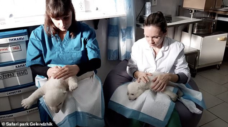 Сообщается, что четыре сотрудницы сафари-парка взяли на себя ответственность вырастить двух брошенных белых медвежат. Сотрудницы поят малышей теплым молоком, подстригают им коготки, делают массаж и круглосуточно заботятся о них.