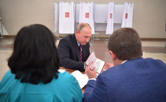 На фото виден паспорт Путина, который держит в руках работник участковой избирательной комиссии. Данные паспорта на фотографии разобрать нельзя, но видно, что необходимые поля заполнены, в документ вклеена черно-белая фотография.