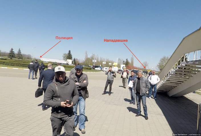 По словам Варламова, на выходе из аэропорта его облили зеленкой и "пару раз ударили". Блогер  выложил фотографии нападавших, которые удалось сделать благодаря включенной камере GoPro.