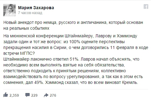 "На мюнхенской конференции Штайнмайеру, Лаврову и Хэммонду задали один и тот же вопрос: из 100 процентов оцените перспективы прекращения насилия в Сирии, о чем договорились 11 февраля в ходе встречи МГПС. Штайнмайер лаконично ответил 51 процент. Лавров начал объяснять, что необходимо всем выполнять взятые на себя обязательства, ответственно подходить к принятым решениям, коллективно взаимодействовать по вопросу урегулирования, а так как в этом есть сомнения, дал 49 процентов. Хэммонд сказал, что во всем виноват Кремль", - написала Захарова.
